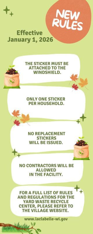The Village of Lac La Belle offers residents a yard waste recycle center located at W379 N6869 N. Lake Road, Oconomowoc, WI 53066. Residents are required to purchase a seasonal permit at the Village Hall, which costs $20.00 (cash or check only). The yard waste recycle center opens April 2, 2025 and will close for the season November 29, 2025.